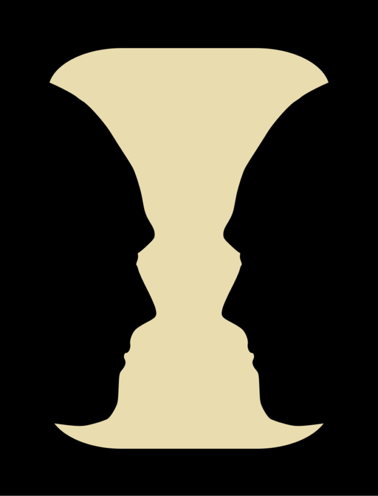 This is Rubin’s vase, an optical illusion that can be seen either as a vase or as two people facing each other.