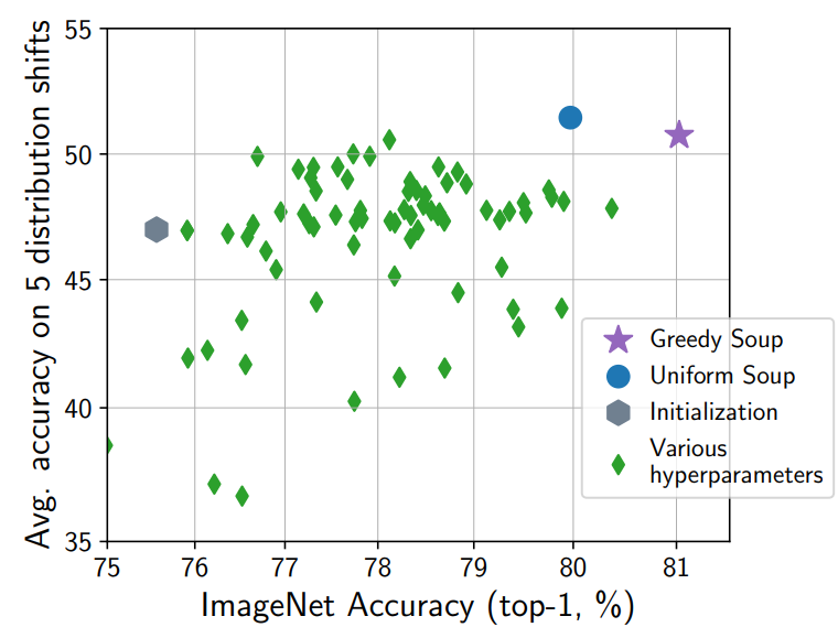 Performance comparison for model soup [Wortsman+ 2022]. X-axis: standard image classification performance. Y-axis: image classification performance under distribution shift. Model soup achieves higher performance than individual models.