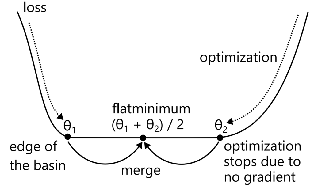 Why does model soup achieve higher performance than a single model? There are several explanations. First, model soup tends to land in flat minima (see the flat-minima figure below). Parameters obtained by fine-tuning from the same pretrained model are linearly mode connected and belong to the same basin. Within a basin, the loss function is convex, so by Jensen’s inequality, averaging reduces the loss. More precisely, the loss can remain the same, but it does not increase. Even if averaging does not reduce the loss, it tends to produce a flatter solution located more centrally within the basin. When optimizing with gradient methods, training stops once the loss reaches 0. If the basin is wide (as in the flat-minima figure), this means training may stop at the edge of the basin. Even among solutions with the same training loss 0, flatter solutions are expected to generalize better. This has also been experimentally confirmed.