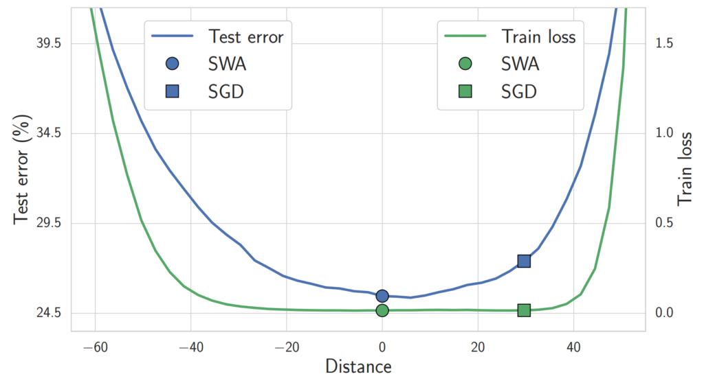 The loss-interpolation figure below plots training error and test misclassification rate for parameters \(\boldsymbol{\theta}^*\) (the final parameters trained by SGD on CIFAR-100 with VGG-16) and \(\boldsymbol{\theta}_{\text{SWA}}\) (parameters obtained by SWA), along the interpolation \(\boldsymbol{\theta} = \alpha \boldsymbol{\theta}^* + (1 – \alpha) \boldsymbol{\theta}_{\text{SWA}}\). The training error is similarly low for both, but the SGD solution \(\boldsymbol{\theta}^*\) lies at the edge of the basin, while the SWA solution \(\boldsymbol{\theta}_{\text{SWA}}\) lies near the center. The test misclassification rate is smaller closer to the center of the basin, and \(\boldsymbol{\theta}_{\text{SWA}}\) has better generalization performance than \(\boldsymbol{\theta}^*\).