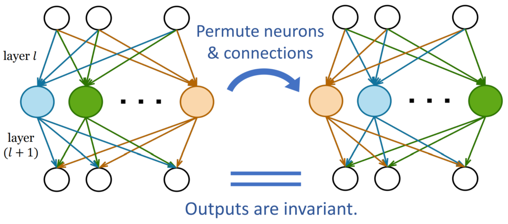Note that all models added to a model soup are fine-tuned from the same pretrained model. In general, if you average models trained from different random initializations, you do not obtain a good model. Intuitively, with different random initializations the dimensions are not aligned, so simple averaging destroys structure. More concretely, the permutation invariance of neural networks plays an important role [Entezari+ 2022]. Neurons in a neural network can be permuted without changing the model’s functional behavior (see the permutation-invariance figure below). However, this permutation swaps parameter dimensions, producing a completely different parameter vector. Models trained from different random initializations do not share the same permutation, so averaging mixes mismatched dimensions, producing a meaningless result.