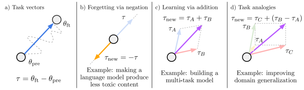 Start from a pretrained model \(\boldsymbol{\theta}_0 \in \mathbb{R}^d\). If \(\boldsymbol{\theta}_1\) is the result of fine-tuning on the dataset of task A, then \(\boldsymbol{\tau}_A = \boldsymbol{\theta}_1 – \boldsymbol{\theta}_0\) is called the task vector for task A.