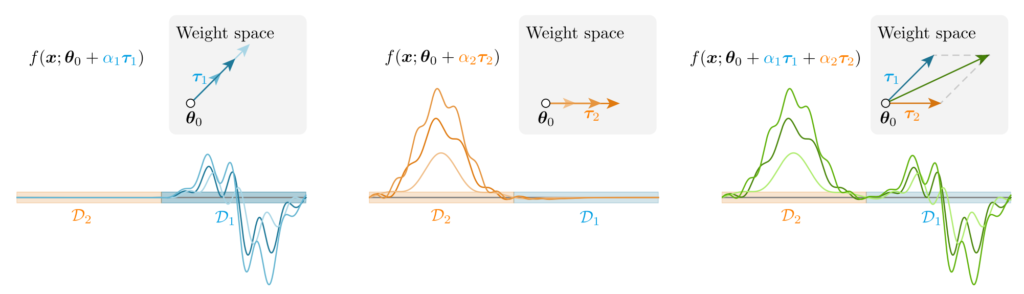 An intuitive explanation of sums of task vectors [Ortiz-Jimenez+ 2023]. Fine-tuning can be interpreted as adding Parzen windows induced by a training dataset. When tasks are unrelated, adding and subtracting task vectors can independently add or remove each task’s effect in function space.