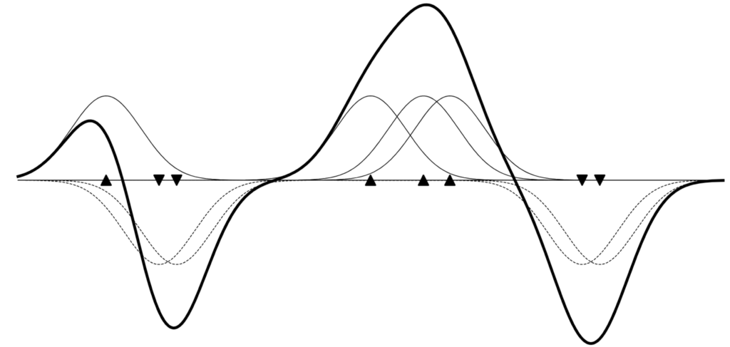 Illustration of Parzen Window: The Parzen window is a non-parametric method for function estimation, in which smooth kernel functions \(k(x_i, x)\) are placed over each given data point \(x_i\). In this figure, Gaussian kernels are applied with signed weights \(\alpha_i \in \mathbb{R}\), and the resulting function is obtained by summing these kernels. Solid lines represent positive components, dashed lines represent negative ones, and their superposition yields the final function estimate (bold line).
