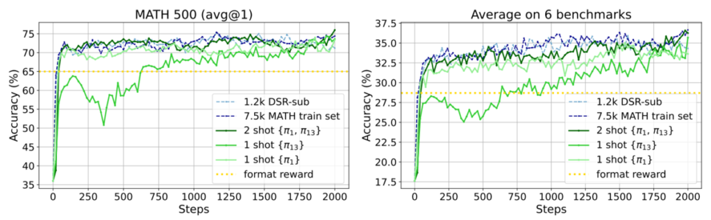 Intuitively, the main takeaway of this work is: if you make an LLM repeatedly think through how to solve one carefully chosen math problem, you can obtain strong reasoning ability. You do not need to prepare a wide variety of problems as in conventional training. With training on only one problem, accuracy on the MATH500 benchmark improved from 36.0% to 73.6%, and the average accuracy across six math benchmarks improved from 17.6% to 35.7%.