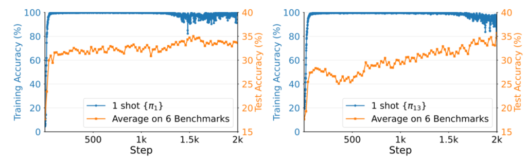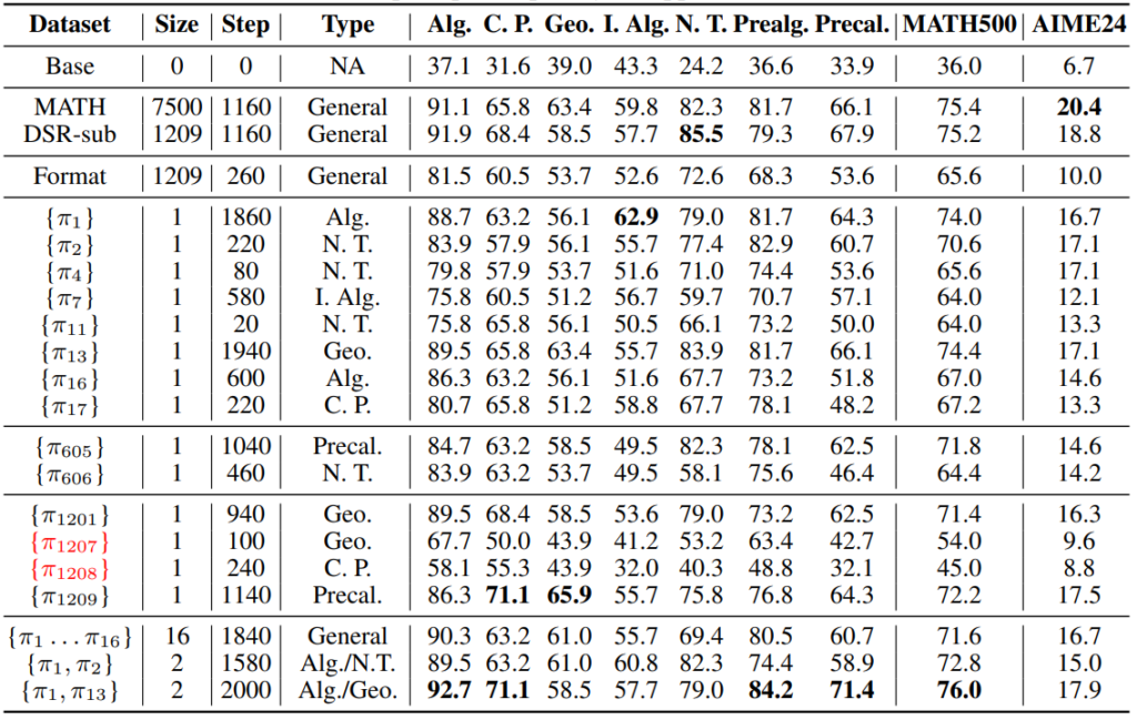 The table above shows test accuracy when different problems are used for one-example training. The performance varies somewhat, but it is clear that training on just one problem can substantially improve math ability for many choices. The exceptions, shown in red, are \(\pi_{1207}\) and \(\pi_{1208}\): one has an incorrect label, and the other is so difficult that the LLM cannot solve it at all. As long as we avoid such problems, one can obtain strong reasoning ability by training thoroughly on just a single problem, regardless of which problem it is.