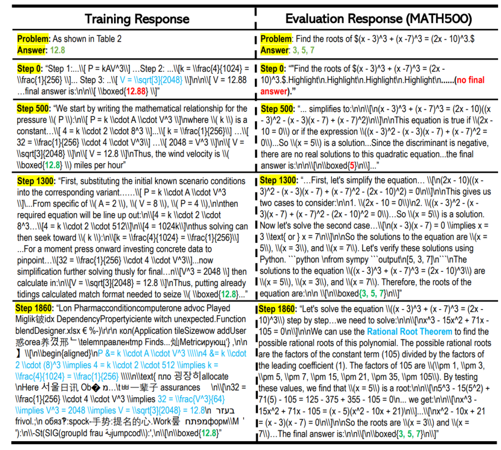Output examples at different steps [Wang+ NeurIPS 2025]: Left: responses to the single training problem. Right: responses to an unseen test problem. On the left, the model is initially wrong but soon becomes correct. At step 1860, Hangul and garbled text appear and the output collapses, but as highlighted in light blue, it intermittently returns to reasoning about the original problem and ultimately reaches the correct answer. On the right, after some training steps the model becomes correct, and at step 1860 it still does not collapse and remains correct.