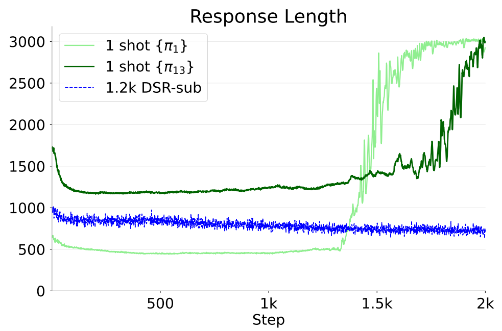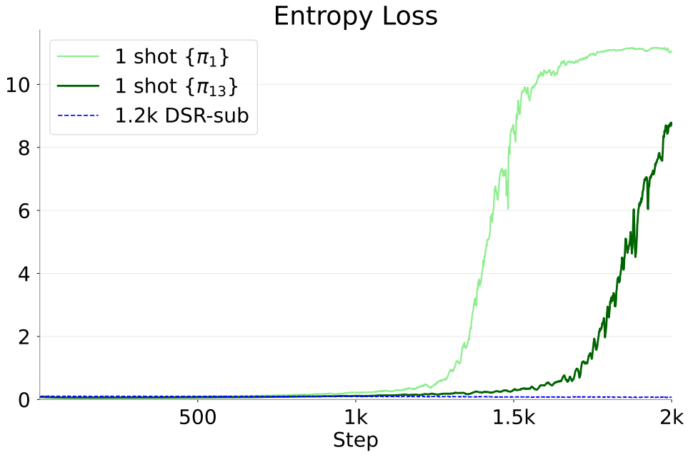 Using \(\pi_1\) as the prompt, we generate multiple responses with different random seeds. Because LLM generation is stochastic, we get diverse outputs. Some will be correct and some will be incorrect. We reward the correct responses to increase their generation probability, and penalize the incorrect responses to decrease their generation probability. We repeat this endlessly: give the same problem \(\pi_1\), generate multiple responses, increase the probability of good ones; then again the same problem; then again the same problem. In conventional training, each round uses different data, but here every round uses the same data point \(\pi_1\). Also, as mentioned above, we use a regularizer that increases entropy and thus promotes output diversity. This encourages diverse solutions even for the same input problem, which can plausibly provide benefits such as: (i) training progresses without collapsing to only correct or only incorrect outputs, (ii) the model can learn many alternative solution paths for the same problem, and (iii) the probability of producing mistakes or tangential text increases, but the model can learn a policy that still returns to correct reasoning and ultimately reaches the correct answer to obtain reward.