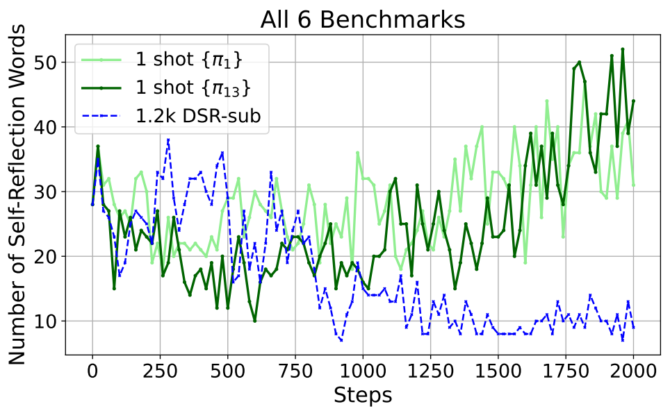 In the figure above, the green line shows how often the model outputs so-called “self-reflection words” such as “rethink,” “recheck,” and “recalculate” when trained on a single example, and this frequency increases during training. By using such words, the model can return to the original reasoning even when its thinking collapses. In other words, once the model acquires these self-reflection words, it becomes more robust to collapse and can tolerate higher entropy. Put differently, in an environment that applies pressure to increase entropy, the model acquires these self-reflection words and becomes resistant to collapse of reasoning. As a result, once it learns these self-reflection words, it becomes more reliable at reaching correct answers on general problems as well.